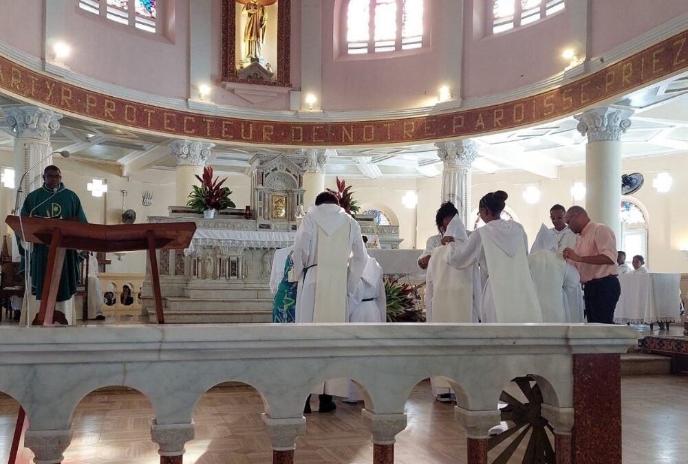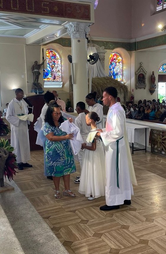 “Moi, N. , je demande à faire partie des servants d’autel de la paroisse du Lamentin, pour montrer davantage mon amour du Christ et le servir à l’autel”, ont-ils répondu à la question du Curé, le père Marcel Antoine CRÉPIN. Puis les nouveaux servants ont été revêtus de leur aube avec l’aide de leurs parents et de servants d’autel plus anciens et ont reçu la bénédiction du Curé.